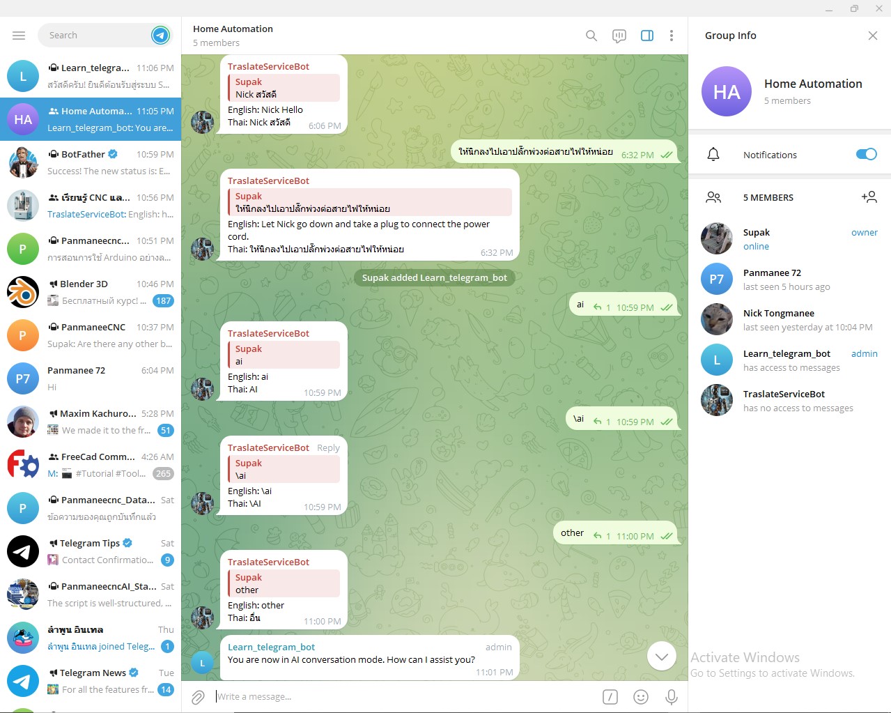 - ส่งข้อความในกลุ่ม Telegram และตรวจสอบว่าบอทตอบกลับถูกต้องหรือไม่