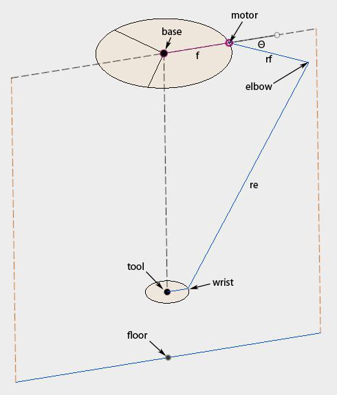 ฟังก์ชันนี้รับตำแหน่ง (X, Y, Z) และคำนวณมุมของมอเตอร์ทั้งสาม (Theta1, Theta2, Theta3) โดยใช้กฎโคไซน์ (Law of Cosines)