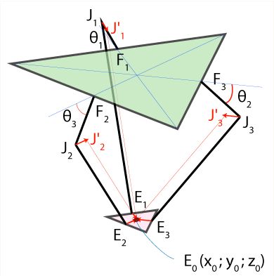 ตำแหน่งของข้อต่อฐานและแพลตฟอร์มปลายทางถูกคำนวณจากพิกัดเชิงขั้ว (Polar Coordinates)